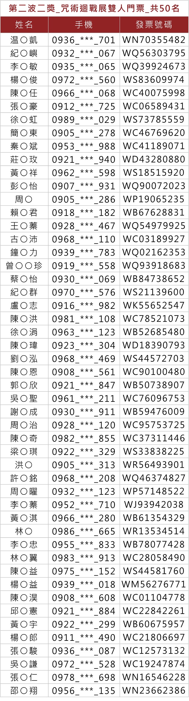 l 二獎:咒術迴戰展雙人門票,共抽出100名(市值:$ 870元)