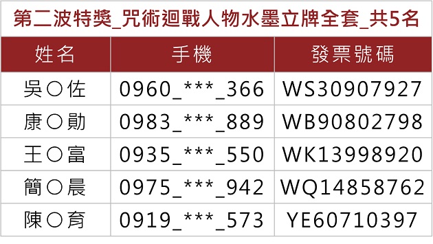 l 特獎:咒術迴戰人物水墨立牌全套(共6款),共抽出10名 (市值:$2,940元)
